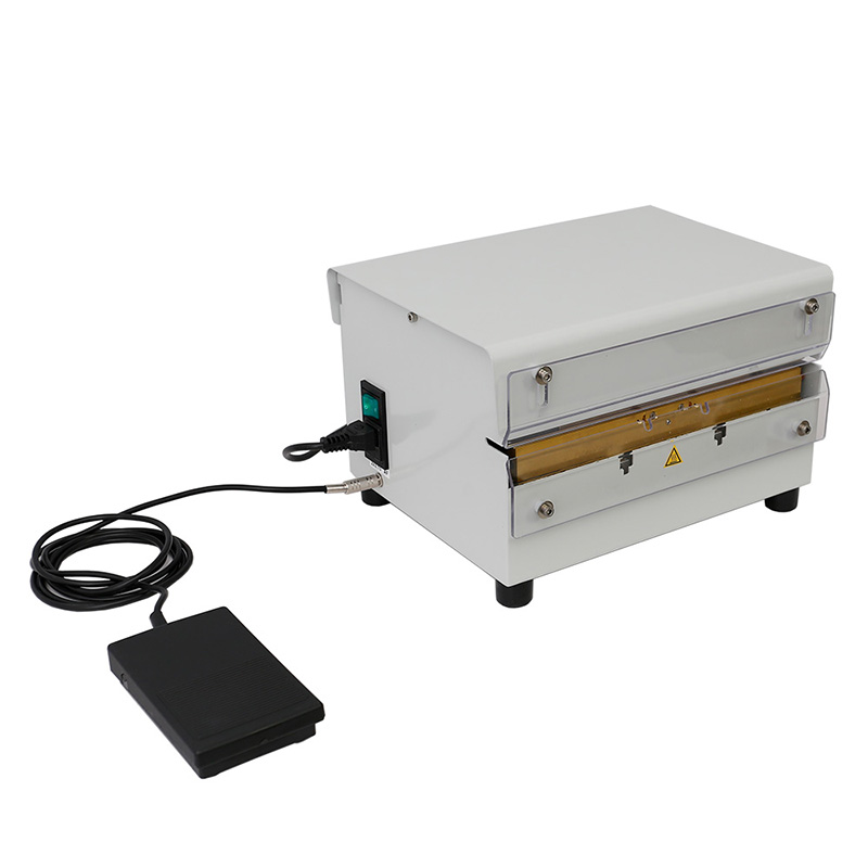 Das Siegelgerät 302 LM verfügt über einen Fußtaster zum Schließen der Schweißbacken. So hat der Bediener beide Hände zum Justieren des Beutels frei.